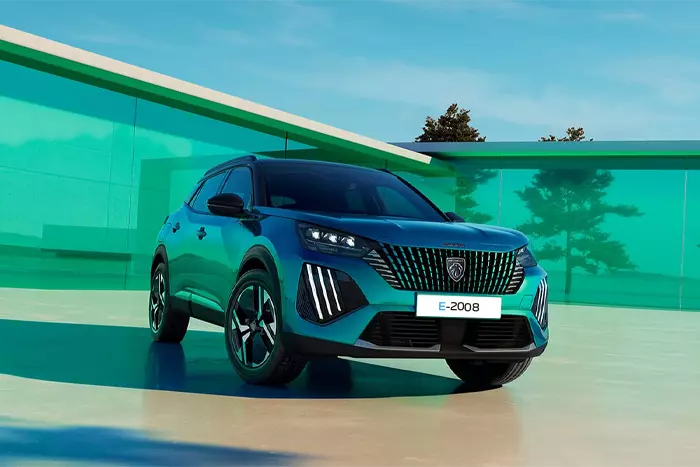 De E-2008 is een elektrische SUV met een bereik tot 406 kilometer (WLTP) en een stijlvol en robuust uiterlijk. Het interieur biedt de Peugeot i-Cockpit met digitaal instrumentarium, comfortabele zitruimte en en koplampen met Peugeot Led technologie.